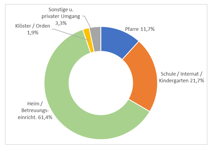 Die überwiegende Mehrheit der Meldungen bezieht sich auf Heime und Betreuungseinrichtungen für Menschen mit Behinderung oder Kranke (61,4%). Auf den schulischen Bereich bzw. zugehörige Internate oder Kindergärten entfallen weitere 21,7%. Die Meldungen aus pfarrlichen Zusammenhängen machen 11,7% aus, jene aus Klöstern und Orden 1,9% (sonstige Zusammenhänge 3,3%).